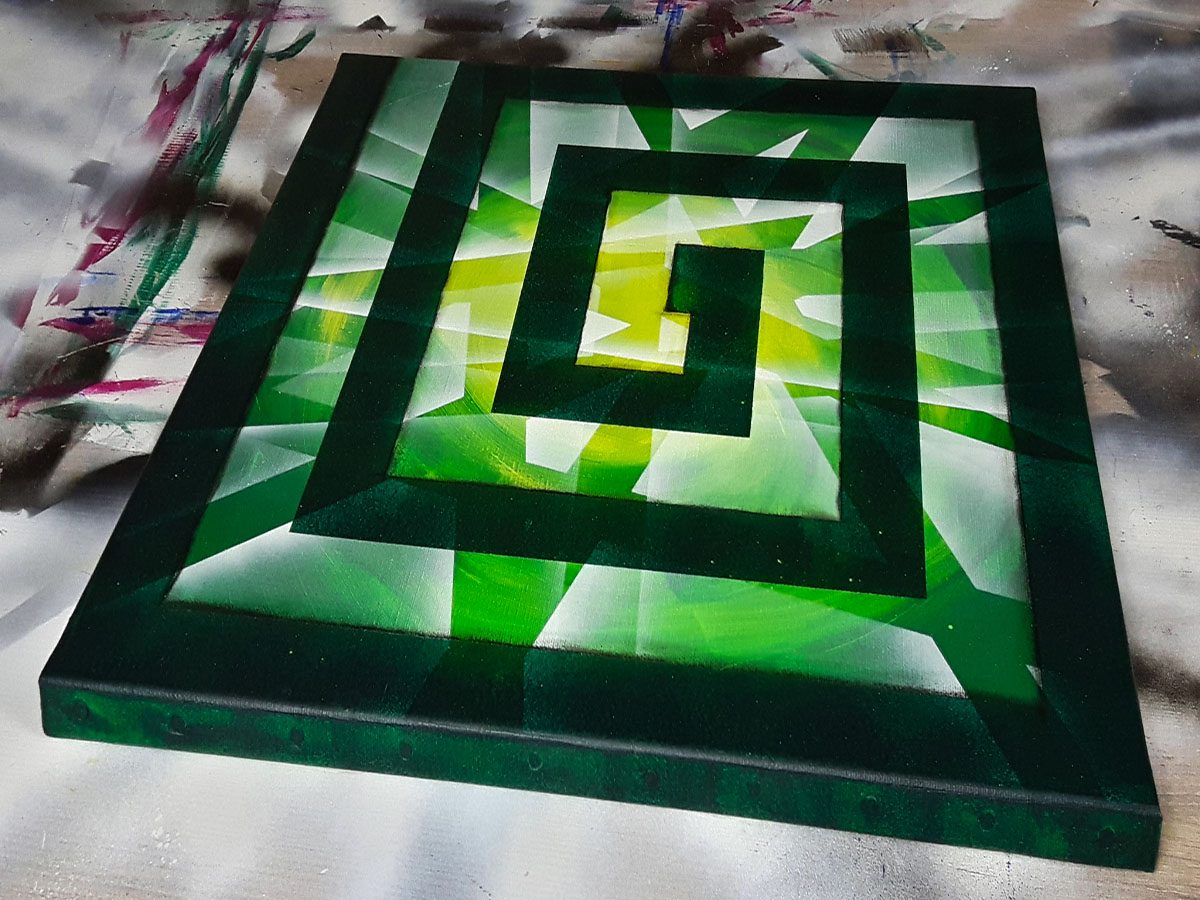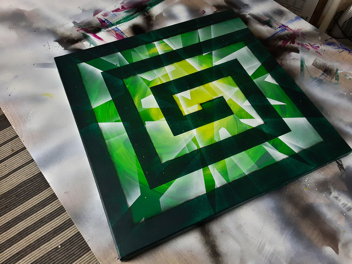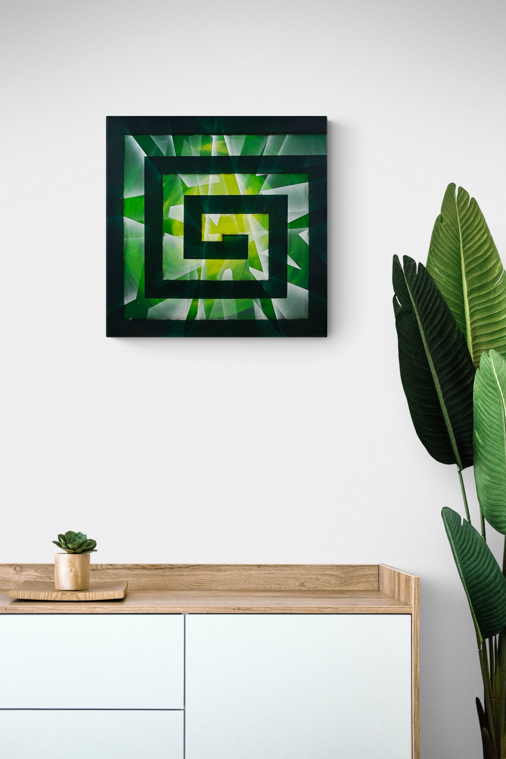 Beau tableau au vert dominant avec sa spirale carrée, ça en jette ! Moderne, originale, décorative Amazona sera bien à sa place dans un salon.