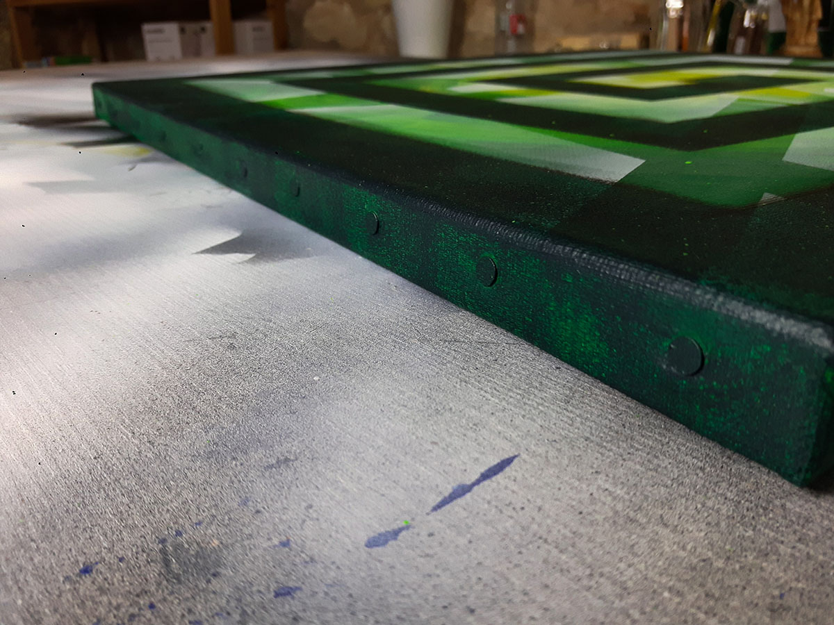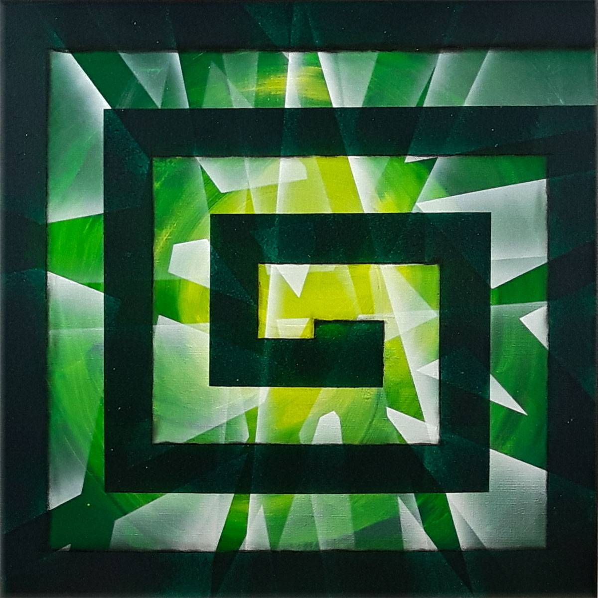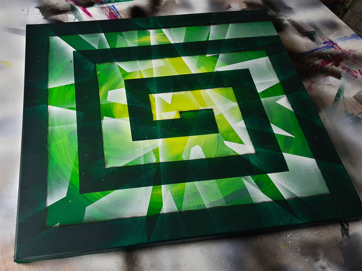 Beau tableau au vert dominant avec sa spirale carrée, ça en jette ! Moderne, originale, décorative Amazona sera bien à sa place dans un salon.