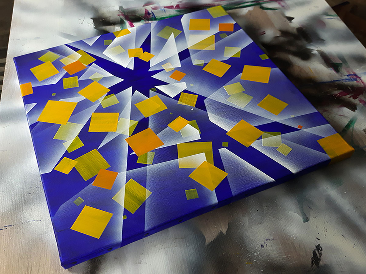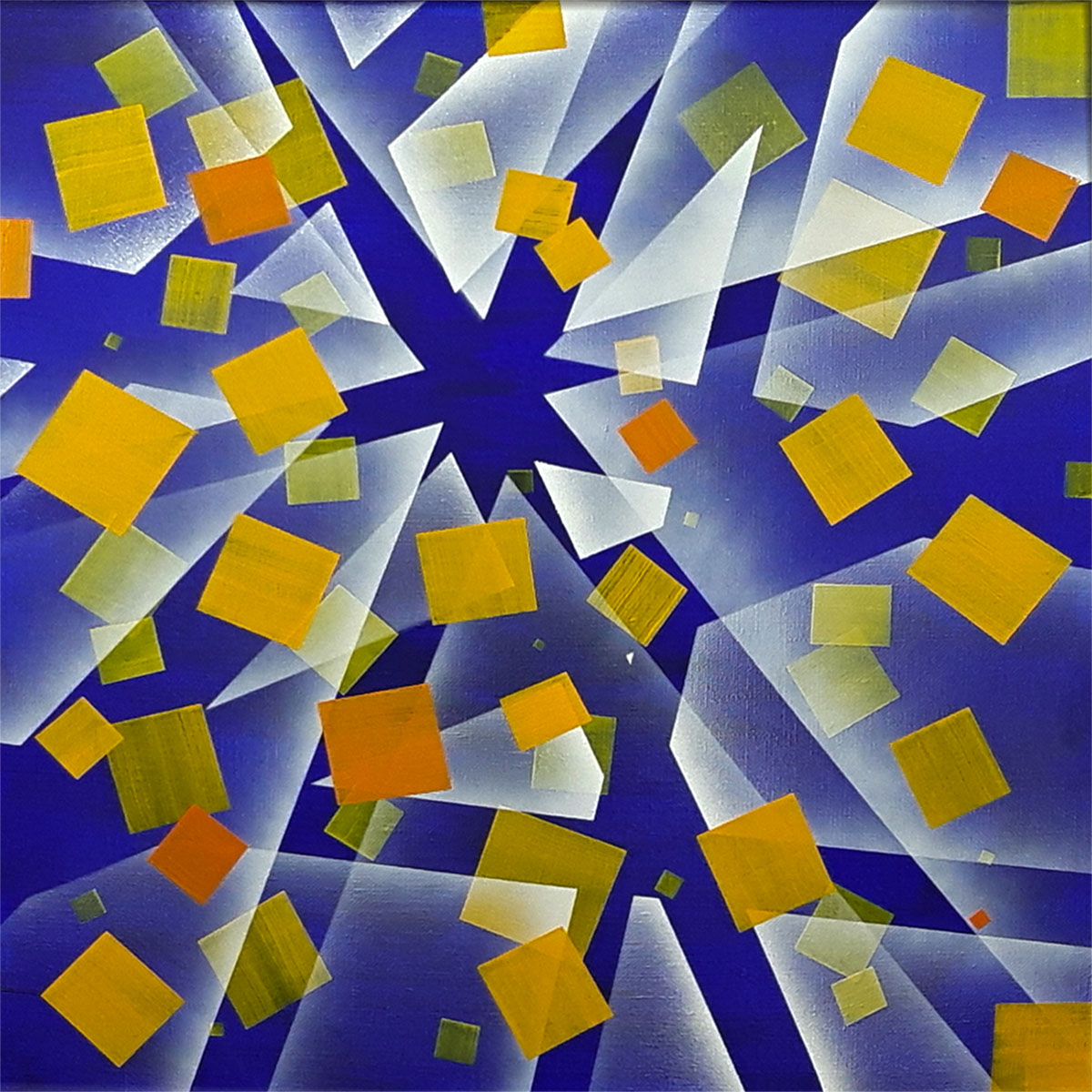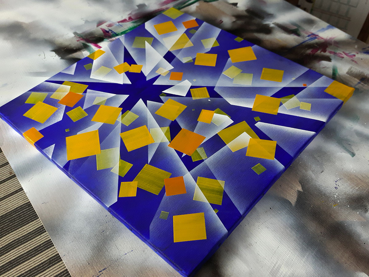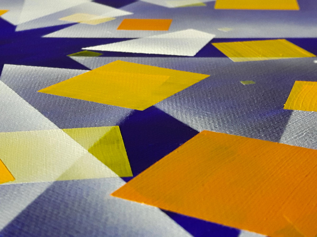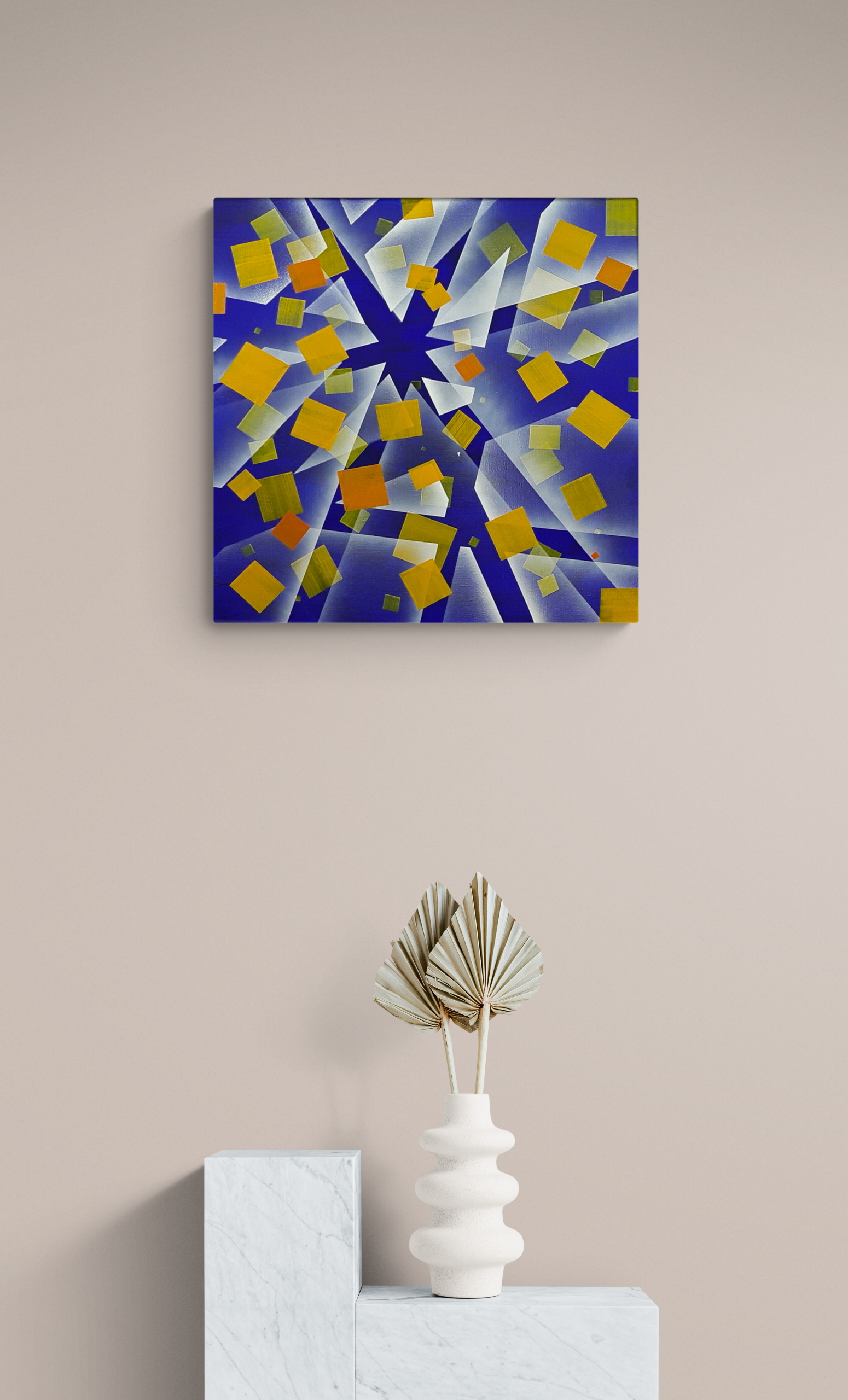 Tableau abstrait original de couleur jaune et bleu dominant, son style est géométrique et structuré.