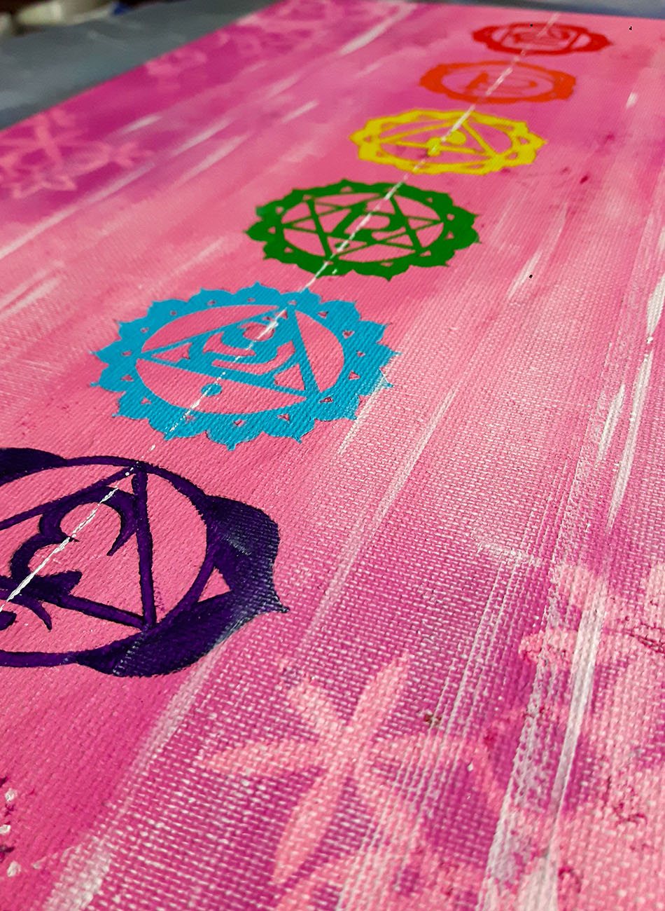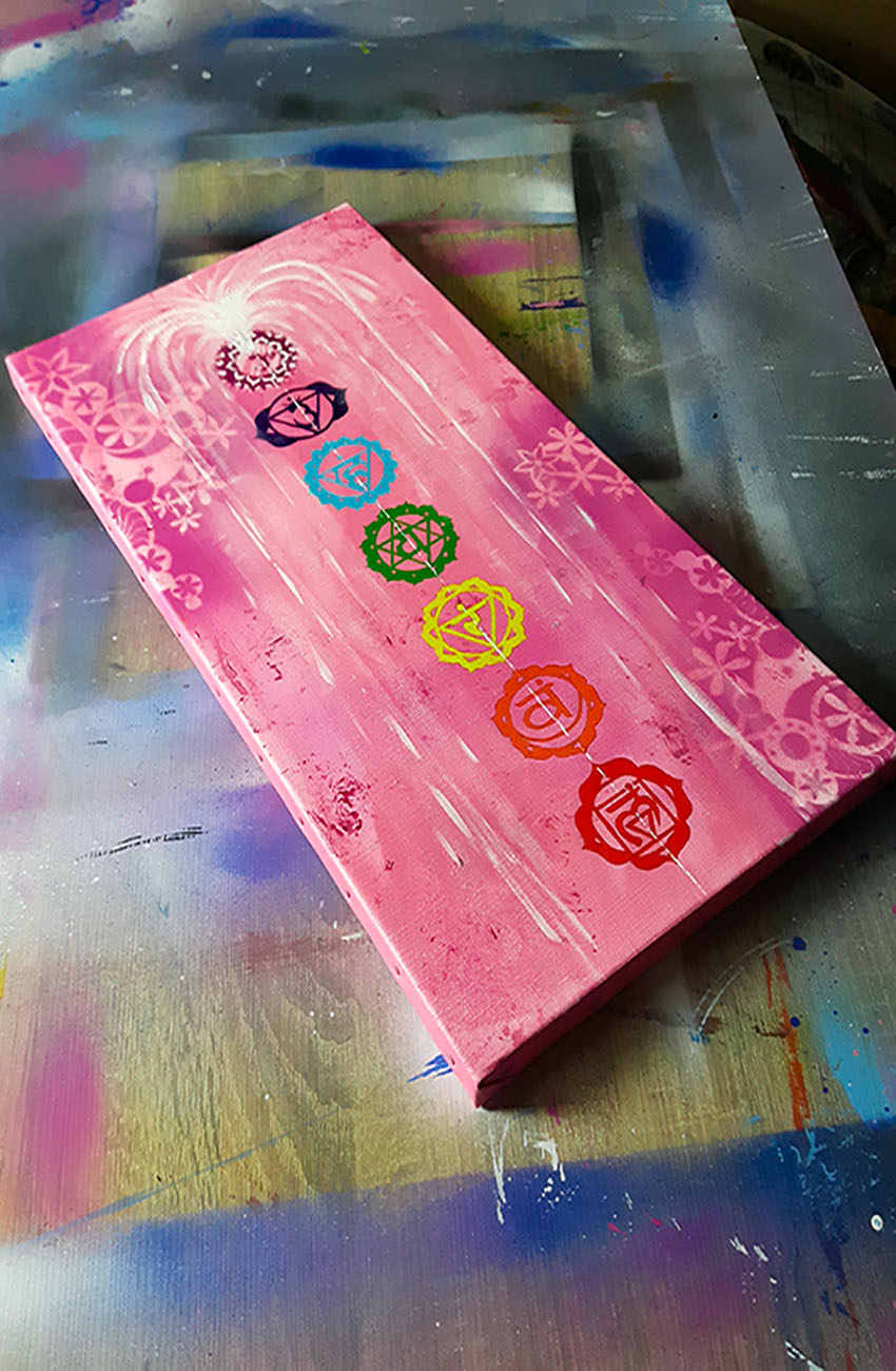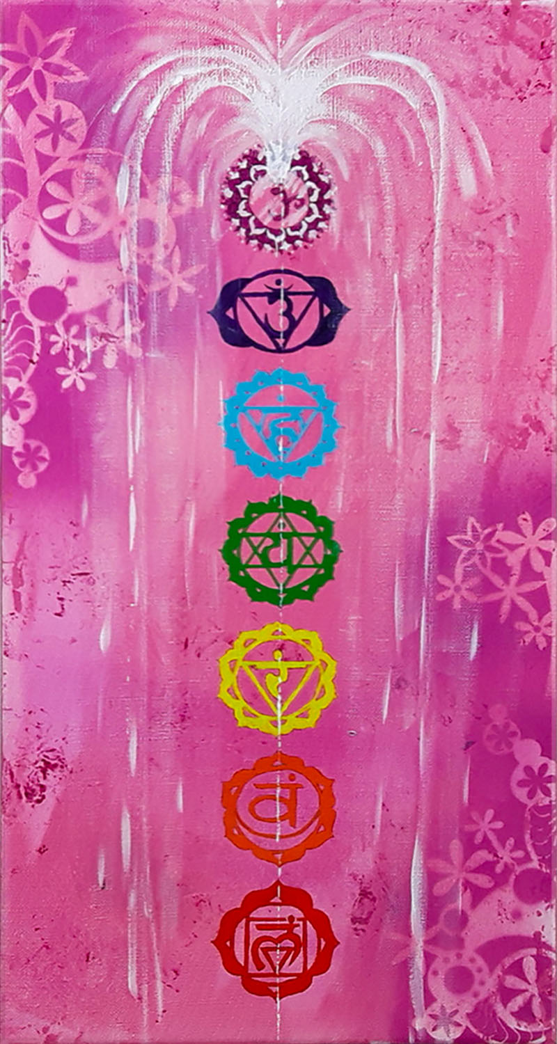 Un tableau méditatif aux couleurs des chakras et leurs symbolismes, une oeuvre unique peint à la main livrée avec certificat d’authenticité.