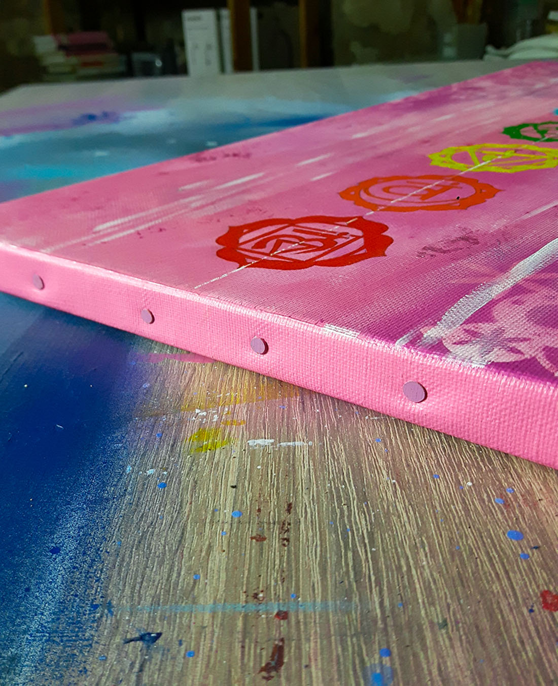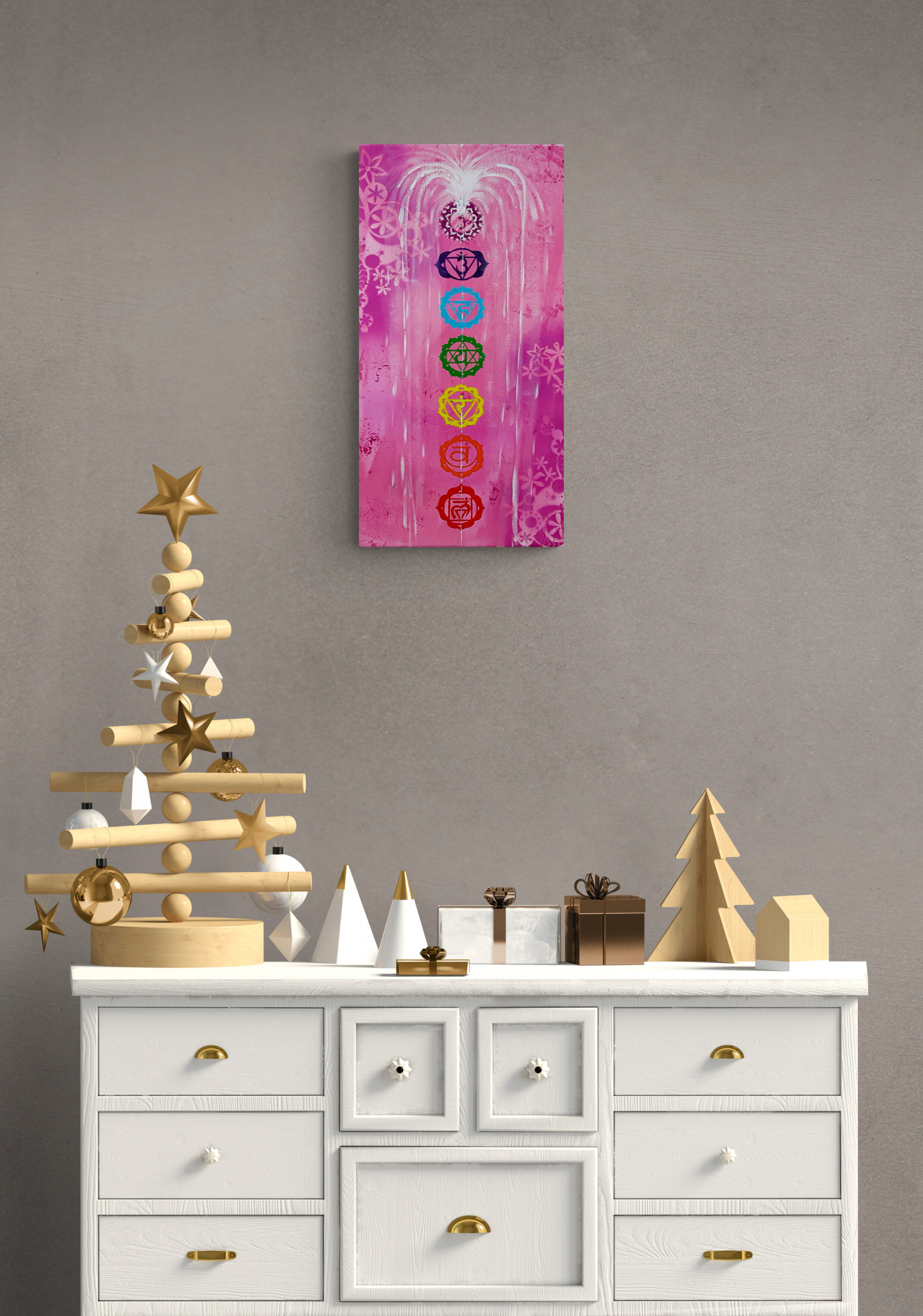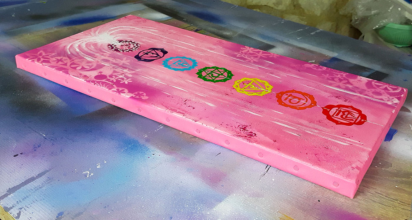 Un tableau méditatif aux couleurs des chakras et leurs symbolismes, une oeuvre unique peint à la main livrée avec certificat d’authenticité.